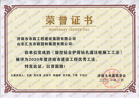 • 2020年度济南市建设尊龙集团优异工法《旋挖钻全护筒钻孔灌注桩施工工法》